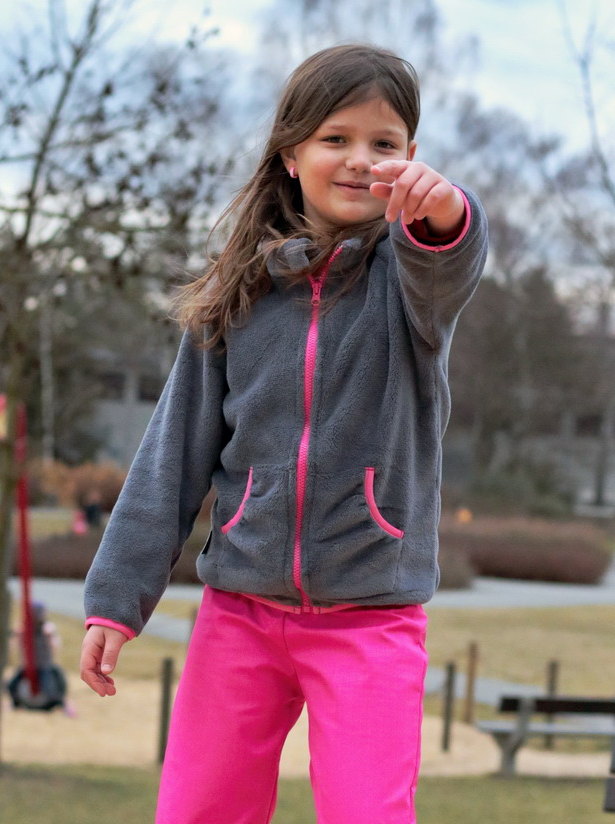 - Dětská mikina chlupatá - tm.šedá s malinovými doplňky - doprodej 122